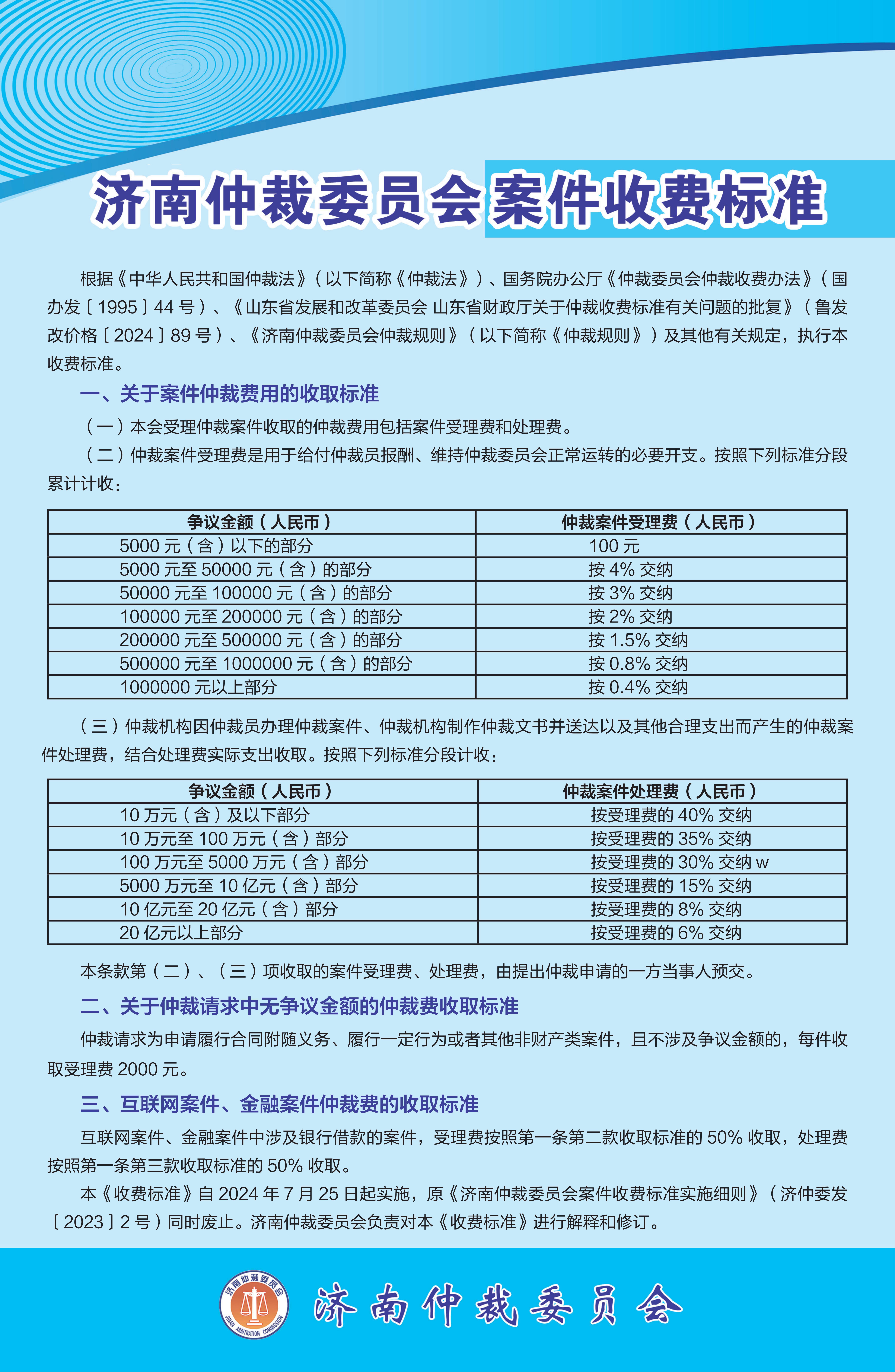 根据《中华人民共和国仲裁法》(以下简称《仲裁法》)、国务院办公厅《仲裁委员会仲裁收费办法》(国办发〔1995〕44号)、《山东省发展和改革委员会 山东省财政厅关于仲裁收费标准有关问题的批复》(鲁发改价格〔2024〕89号)、《济南仲裁委员会仲裁规则》(以下简称《仲裁规则》)及其他有关规定,执行本收费标准。 一、 关于案件仲裁费用的收取标准 (一)本会受理仲裁案件收取的仲裁费用包括案件受理费和处理费。 (二)仲裁案件受理费是用于给付仲裁员报酬、维持仲裁委员会正常运转的必要开支。按照下列标准分段累计计收: